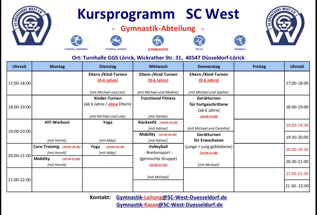 Bewegung hält fit, macht Spaß und verbindet – deshalb bietet der SC Düsseldorf West eine eigene Abteilung für Gymnastik an. In der Turnhalle in Lörick schaffen wir Raum für Bewegung, Gesundheit und Gemeinschaft,für Groß und Klein.